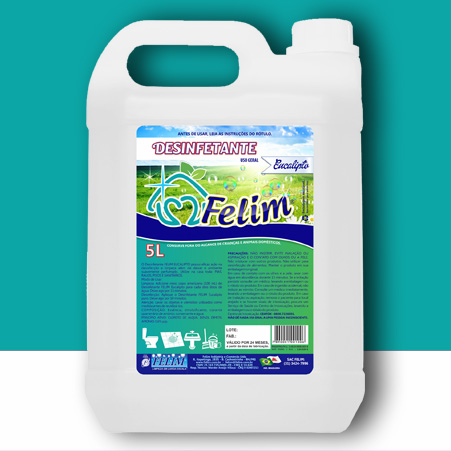 O Desinfetante FELIM possui eficaz ação na desinfecção e limpeza, além de deixar o ambiente suavemente perfumado. Pode ser utilizado nos mais variados locais: pias, ralos, pisos e sanitários. É apresentado nas versões eucalipto, floral, lavanda, pinho, roxinho, sensação e talco.